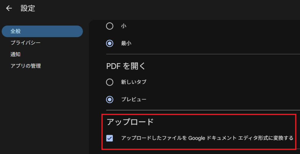 Google ドライブの設定 → 全般 → 「アップロードしたファイルを Google ドキュメント エディタ形式に変換する」のチェックボックスを ON にします。