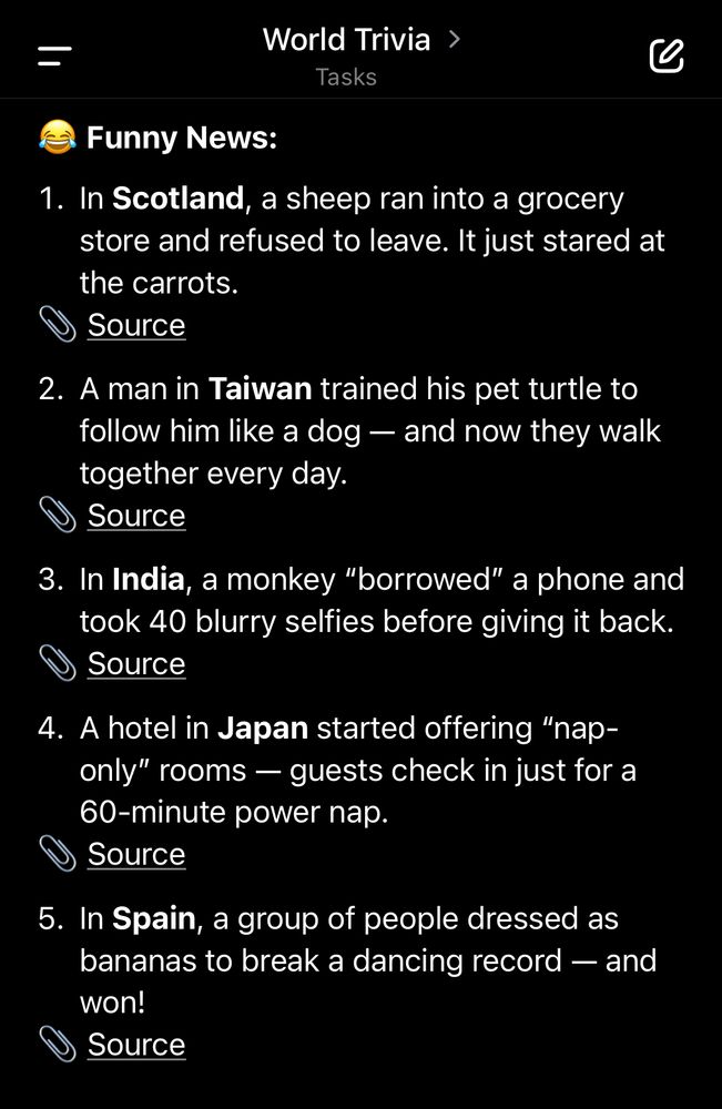 色々と試してみていいなーと思ったのが、「ChatGPT の Tasks 機能を使って、世界の国々のトリビア&笑えるニュースを英語で毎朝届けてもらう」というものです。