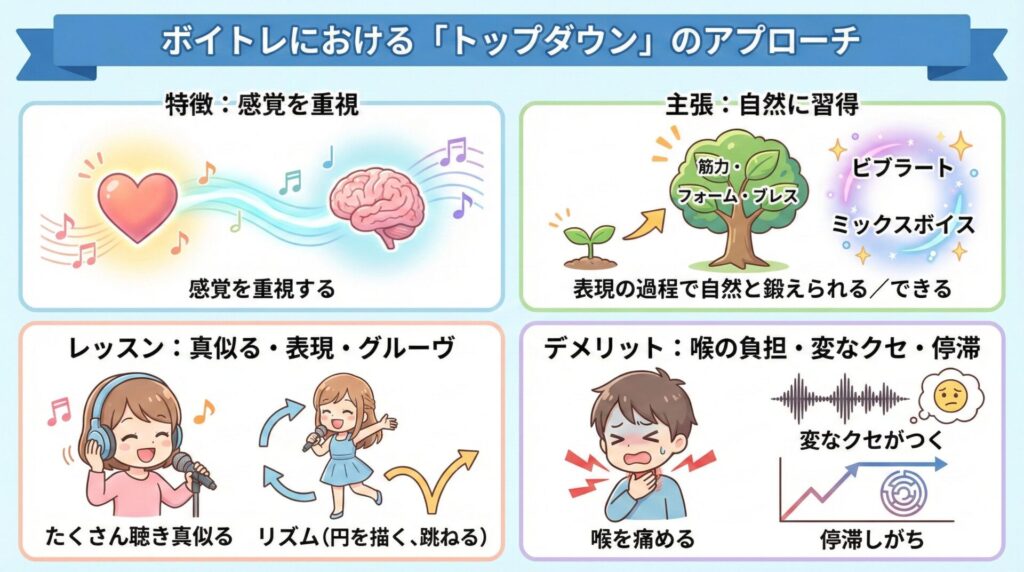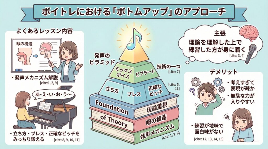 この2種類のアプローチに気付くと同時に、過去にボーカルスクールで教わっていたのが「トップダウン」のアプローチだったことにも気が付きました。