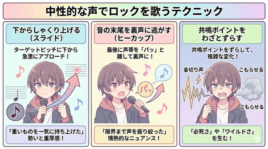 以前から「中性的で厚みのない声」が悩みだった僕ですが、それでも好きなこの曲を少しでも「ロックらしく」歌えるように、いくつかのテクニックを盛り込んでみました。