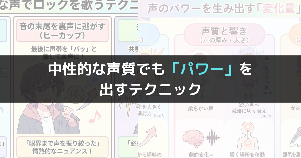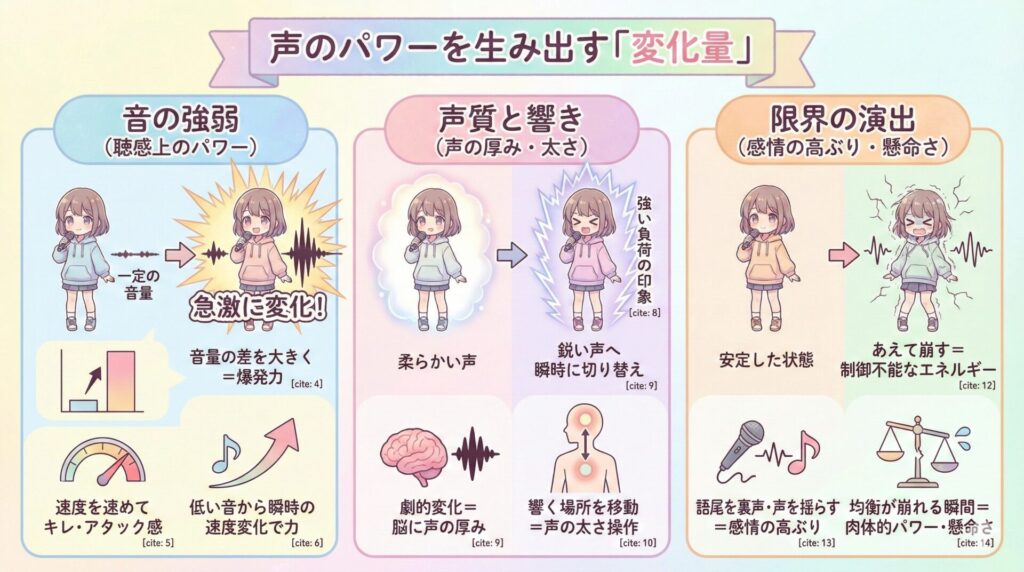 この考えをもとにすれば、歌の聴き手に「パワー」を感じさせるためには、必ずしも声量を上げる必要はないとも言えます。
