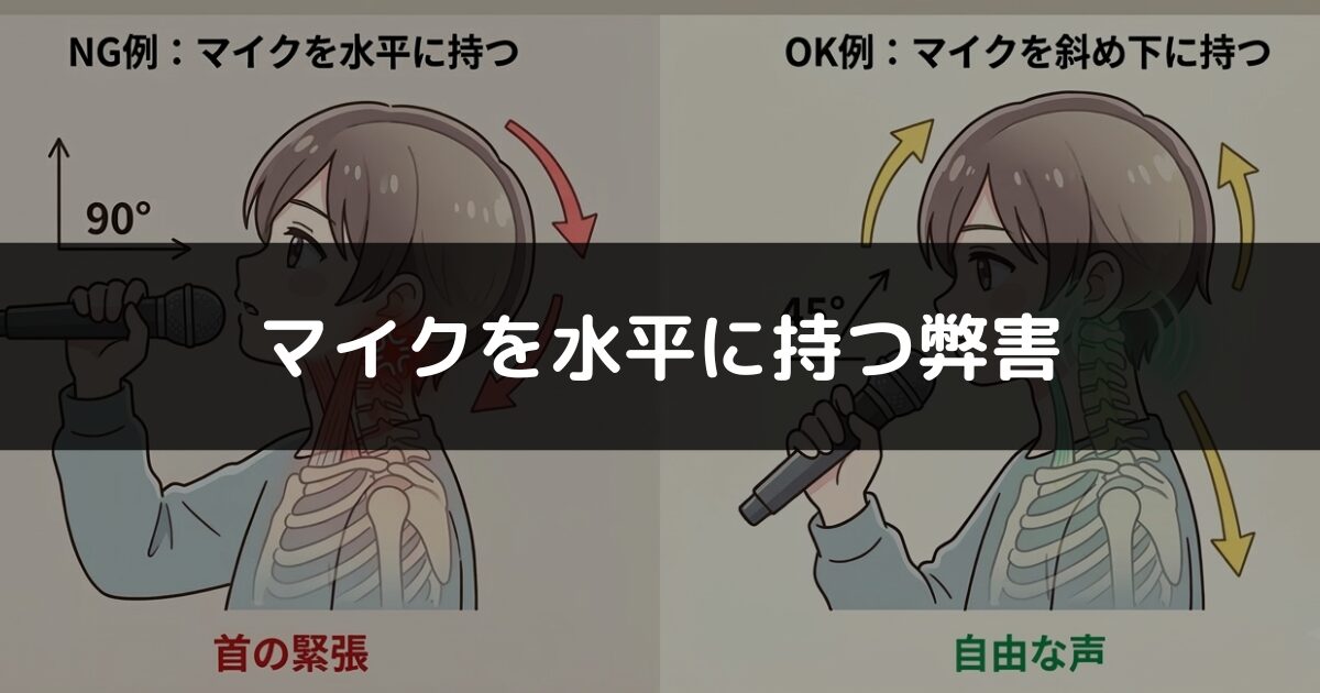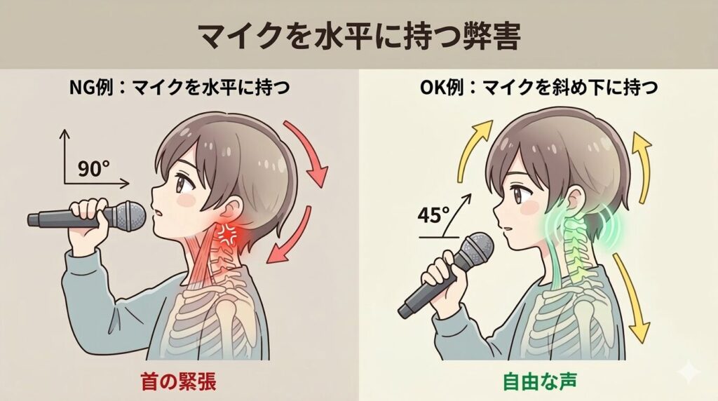 その原因が、マイクを水平に持つことで頭が後ろに傾き、首に緊張が生まれてしまうせいだとわかりました。