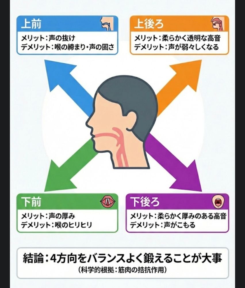 これら経緯を上の図に当てはめてみると、声の悩みとその改善方法の多くは、「4方向のつり合い」が関係しているように思えます。
